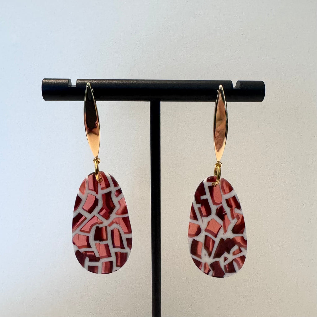 Fun earrings to brighten up any day. Made of lightweight acetate with translucent red and opaque white.